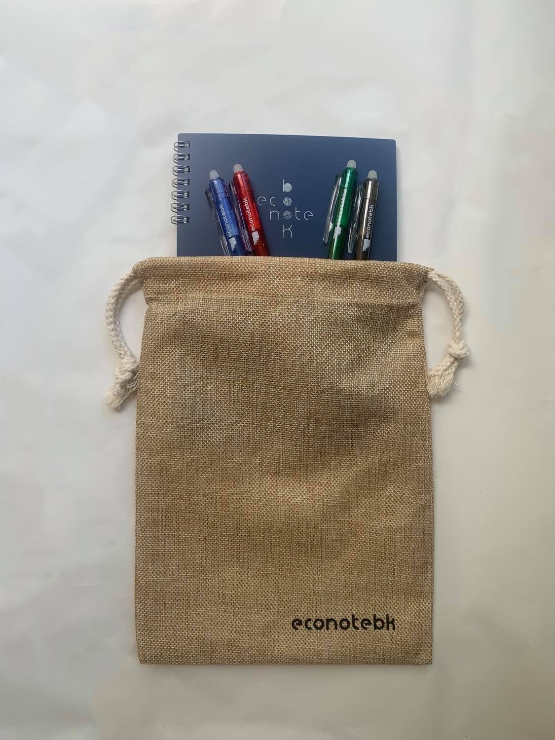 - Choix des accessoires : toile de jute personnalisable, 3 stylos gel de couleurs verte, rouge ou bleue