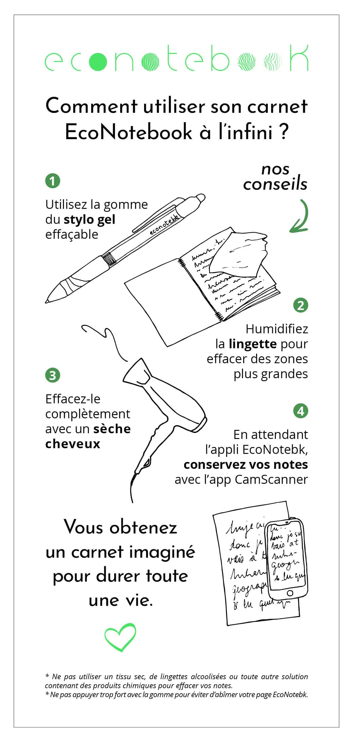 - Le pack : un format A4, A5, ou A6, un stylo friction gel, un porte-stylo adhésif et une lingette pour effacer