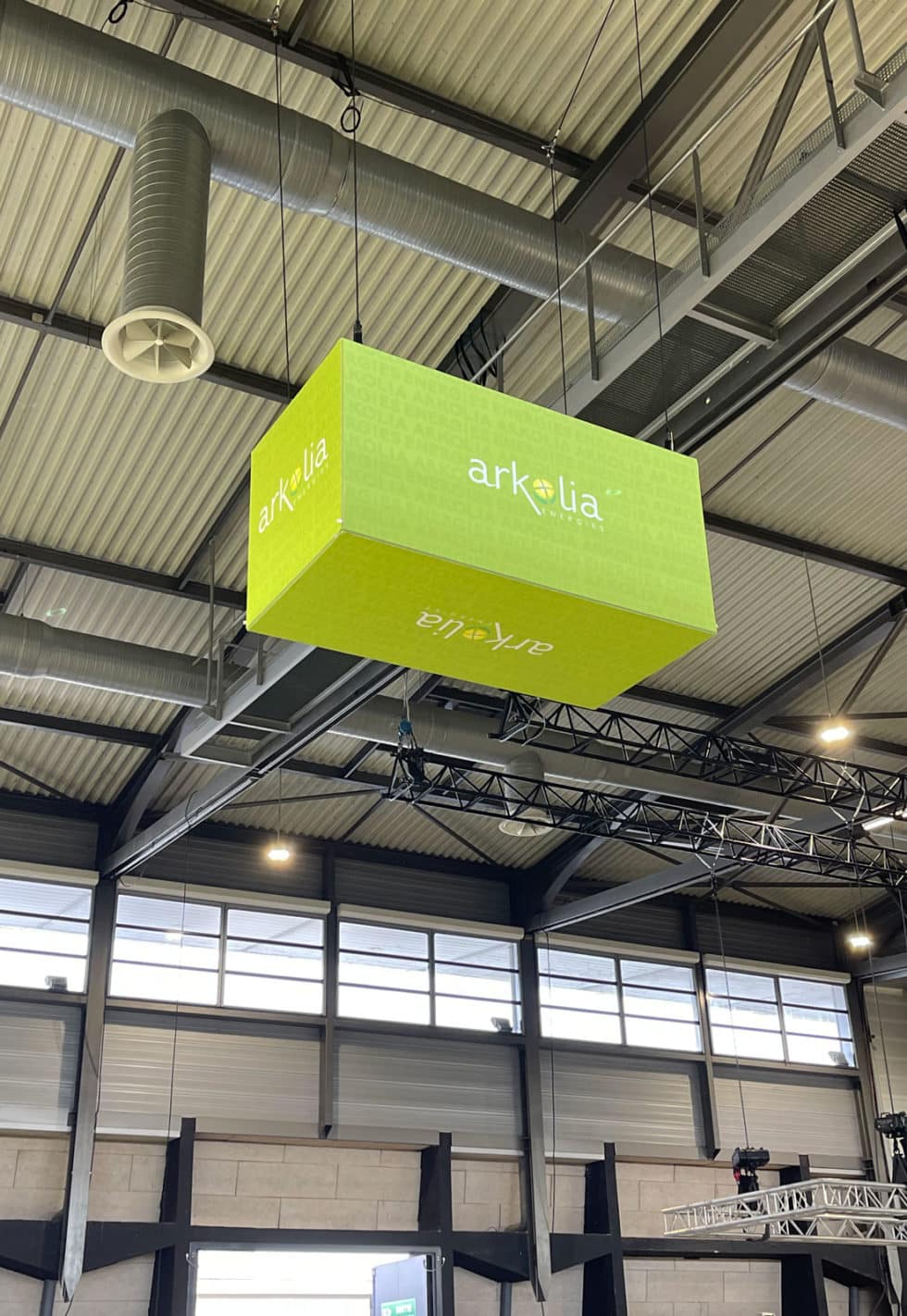 - Des formes au choix : Personnalisez la forme de votre enseigne en fonction du design de votre stand. Optez pour une enseigne élinguée cubique ou rectangulaire pour une présentation qui correspond à votre identité visuelle.