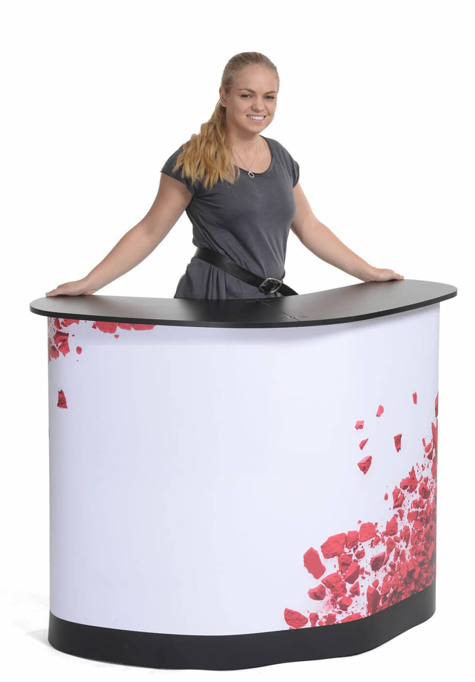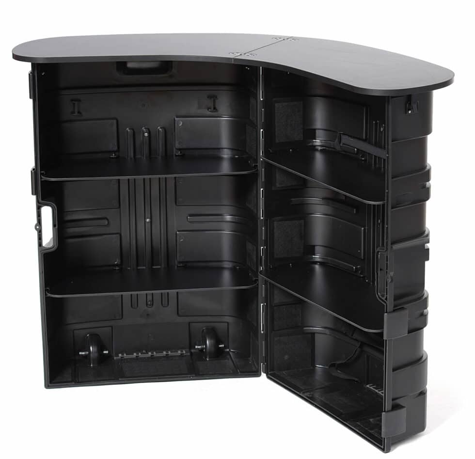 • Multi-fonctions : Il sert Ă  la fois de comptoir d'accueil pour interagir avec vos visiteurs et de valise pour transporter vos Ă©lĂ©ments essentiels.