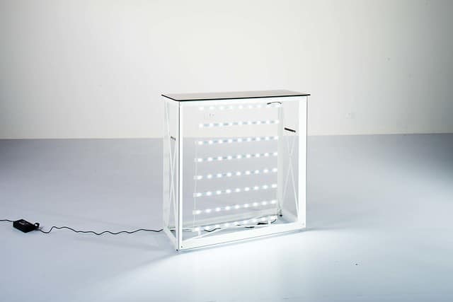 Ce comptoir polyvalent est conçu pour répondre à divers besoins de communication, que ce soit en mode recto ou recto-verso. De plus, il est disponible en deux versions : lumineuse, avec des rideaux de LED pour un impact visuel saisissant, ou non lumineuse pour une option plus sobre.