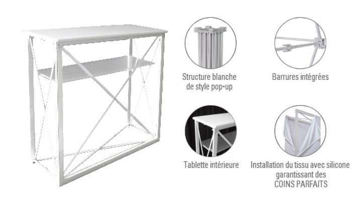 Le Comptoir Xperience est la solution idéale pour accueillir vos clients avec style et personnalisation. Cette structure en aluminium, équipée de connecteurs mécaniques et de barres rainurées clippées, offre une base solide pour vos activités promotionnelles.