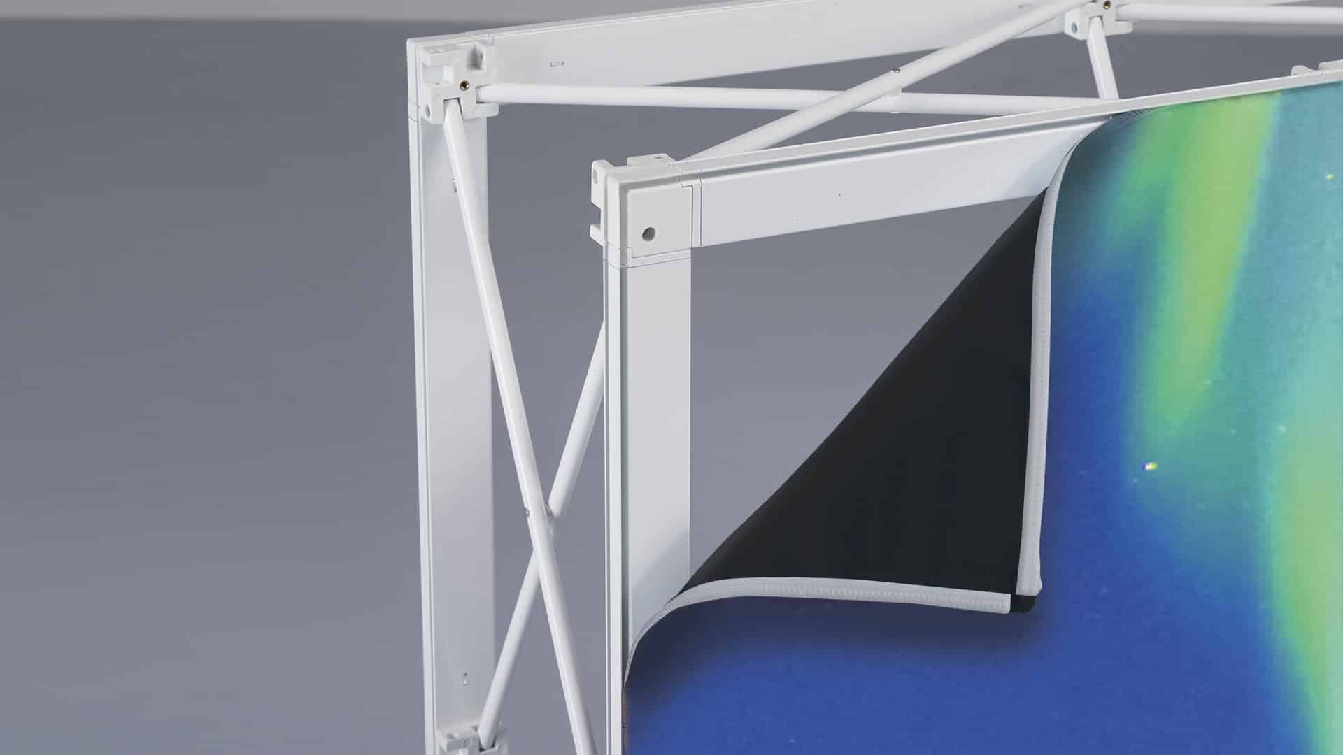 xperience est une solution de pop-up tissu avec barres d’angles rainurées permettant d’insérer un visuel avec joint silicone pour une finition parfaite.