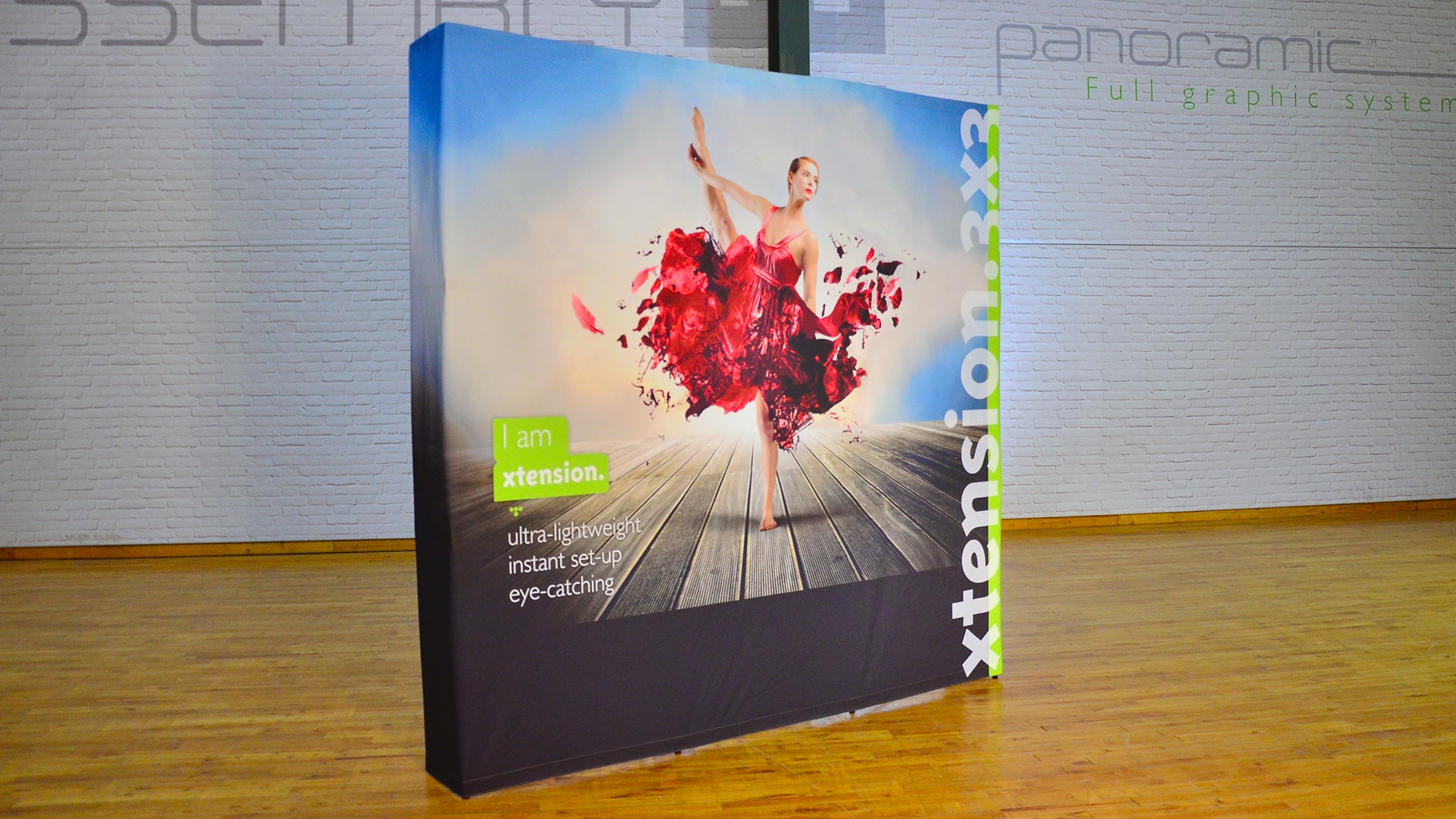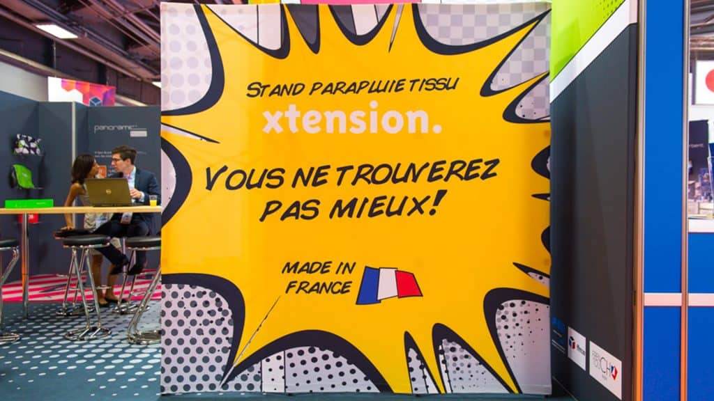 xtension est une solution de stand parapluie intégrant un visuel tissu imprimé par sublimation, offrant un rendu de couleurs exceptionnel. Le visuel reste relié à la structure, montage et démontage sont donc simples, rapides et intuitifs !